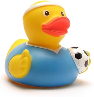 Duckshop I Badeente I Quietscheente I Ente Fußballer blaues Trikot I L: 7,5 cm I inkl. Badeenten-Schlüsselanhänger im Set